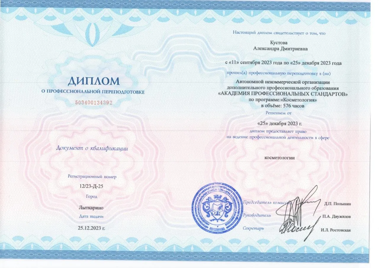 - 2023 год Профессиональная переподготовка по специальности «косметология», 576 часов, Академия профессиональных стандартов, г. Москва