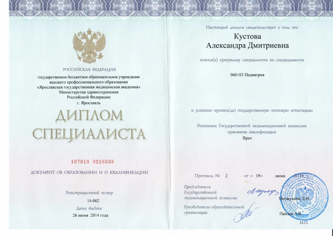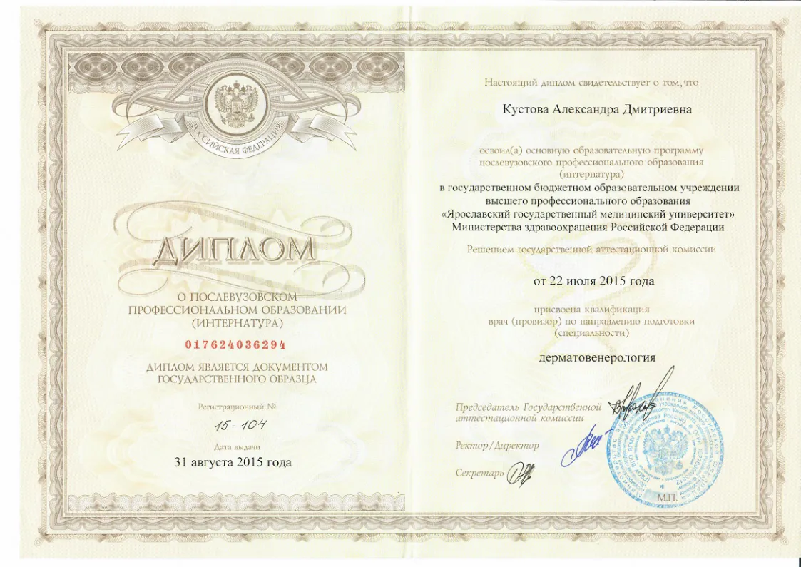 - 2015 год Интернатура по дерматовенерологии на кафедре кожных и венерологоческих болезней ЯГМУ, г. Ярославль