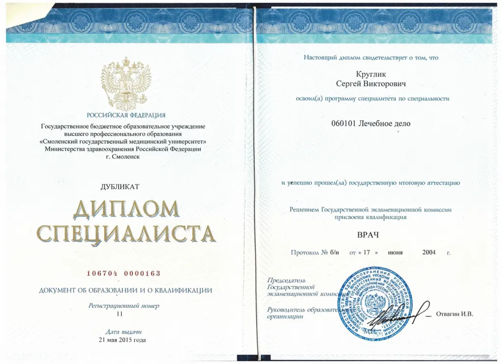 - Диплом 106704 0000163, рег. Номер 11, ГБОУВПО "Смоленский государственный медицинский университет" МЗ РФ г. Смоленска, 2004 г.;