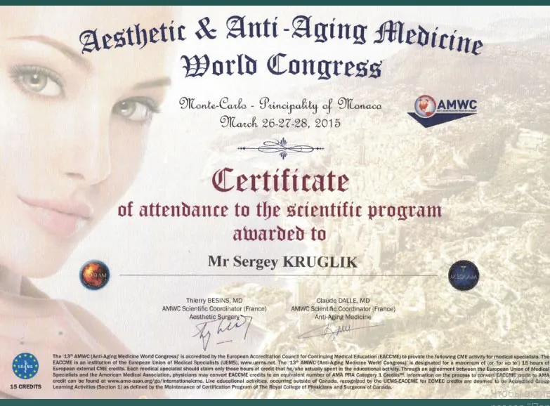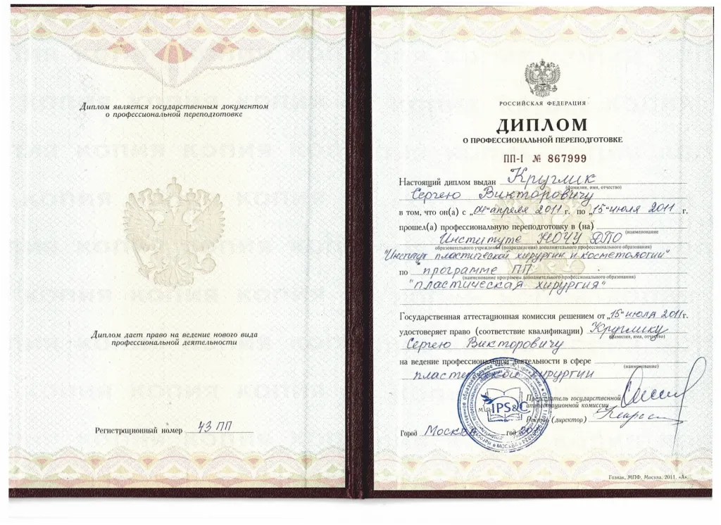 - Пластических хирург Сертификат 1177240486464 № 40-16 от 18.08.2016 г.;
