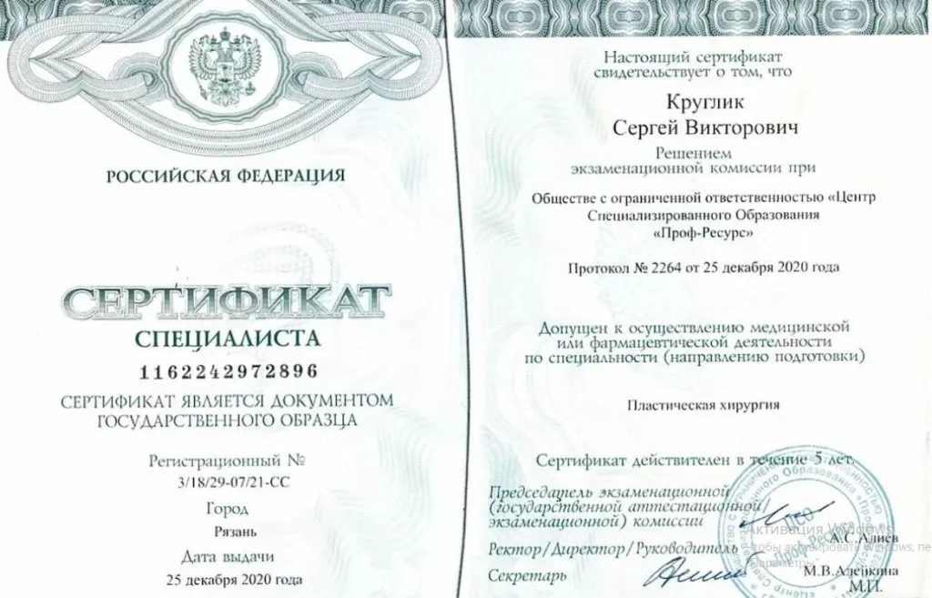 - Пластических хирург Сертификат 1162242972896 3/18/29-07/21-СС от 25.12.2020 г.;